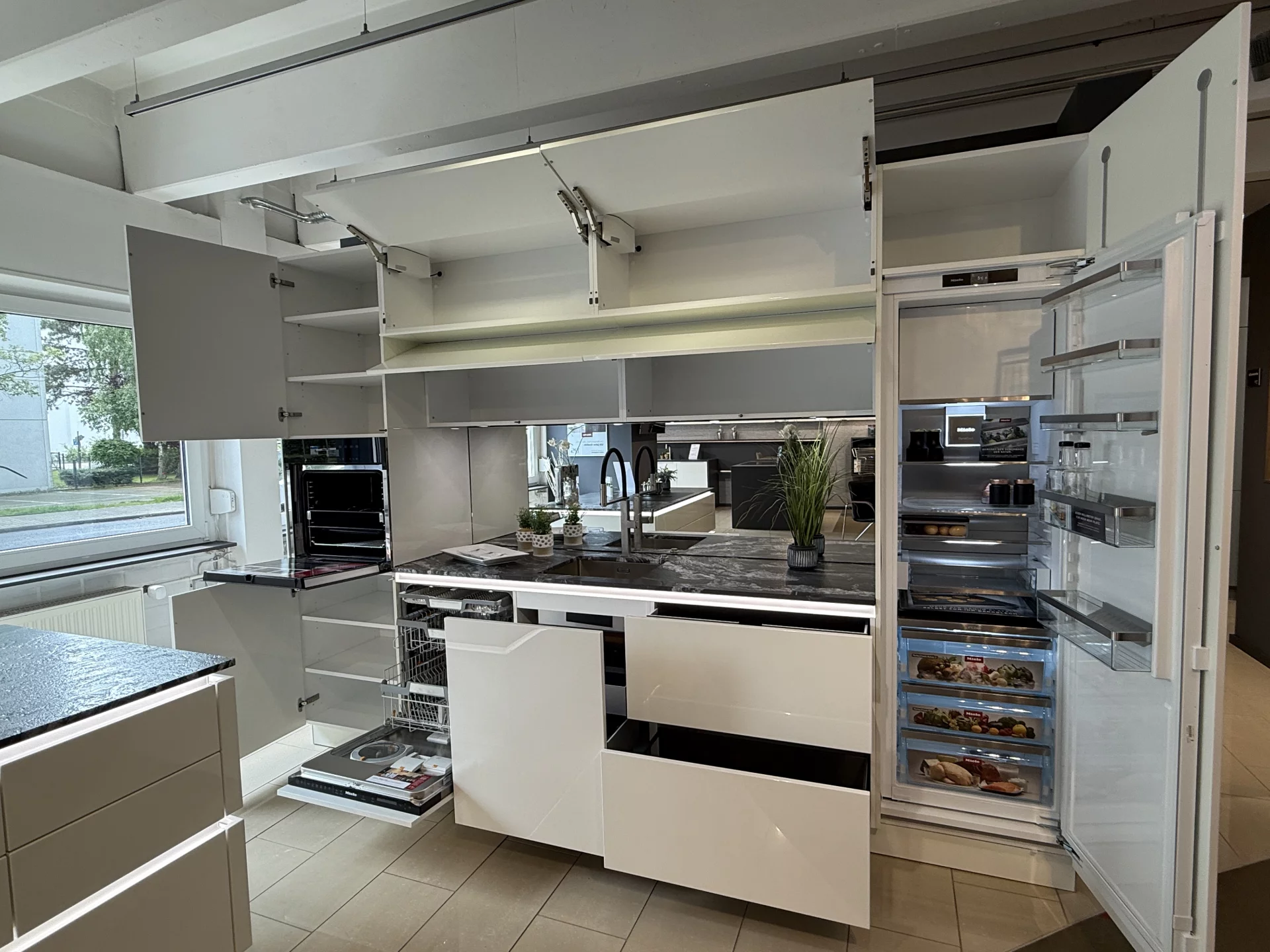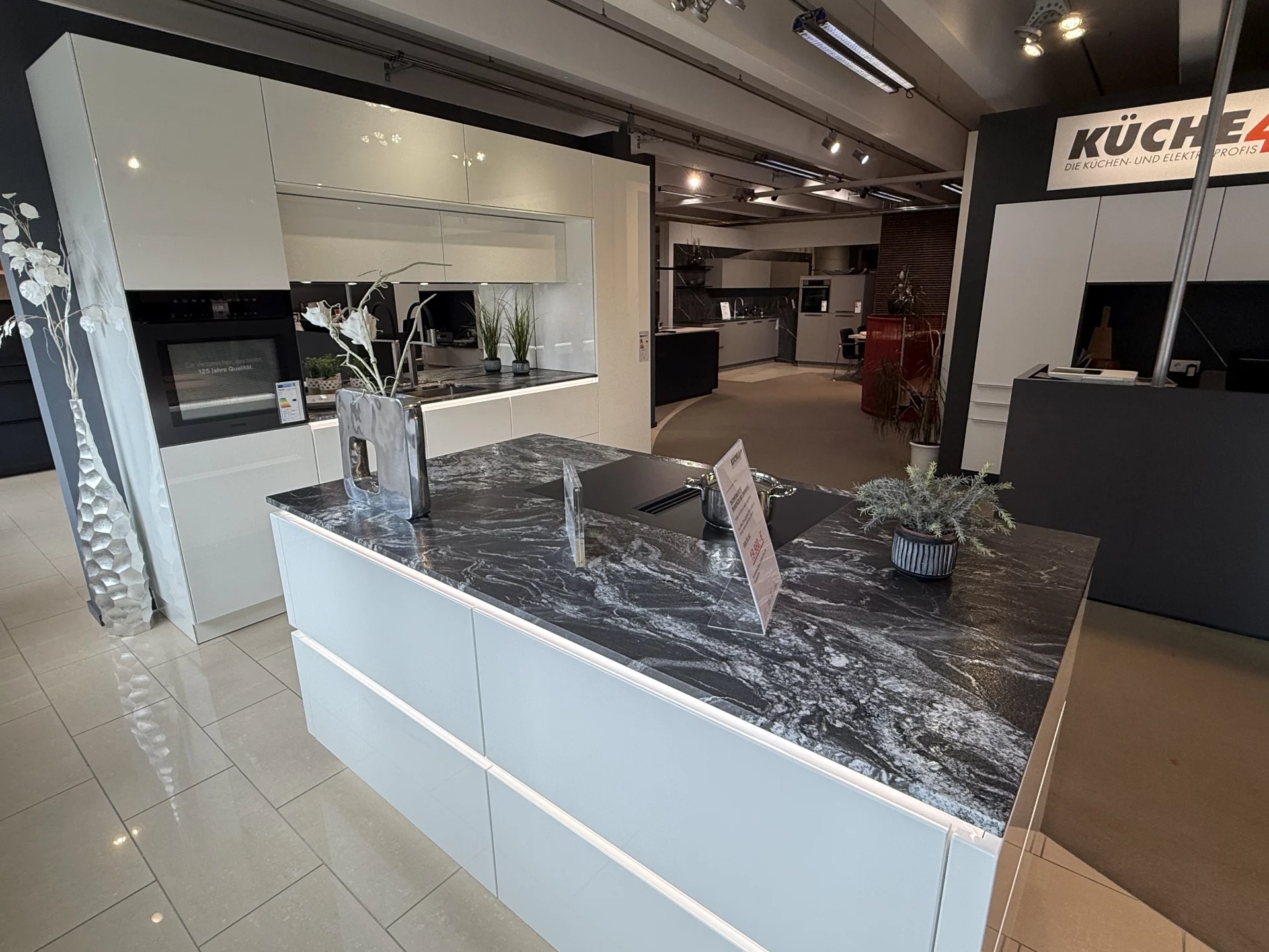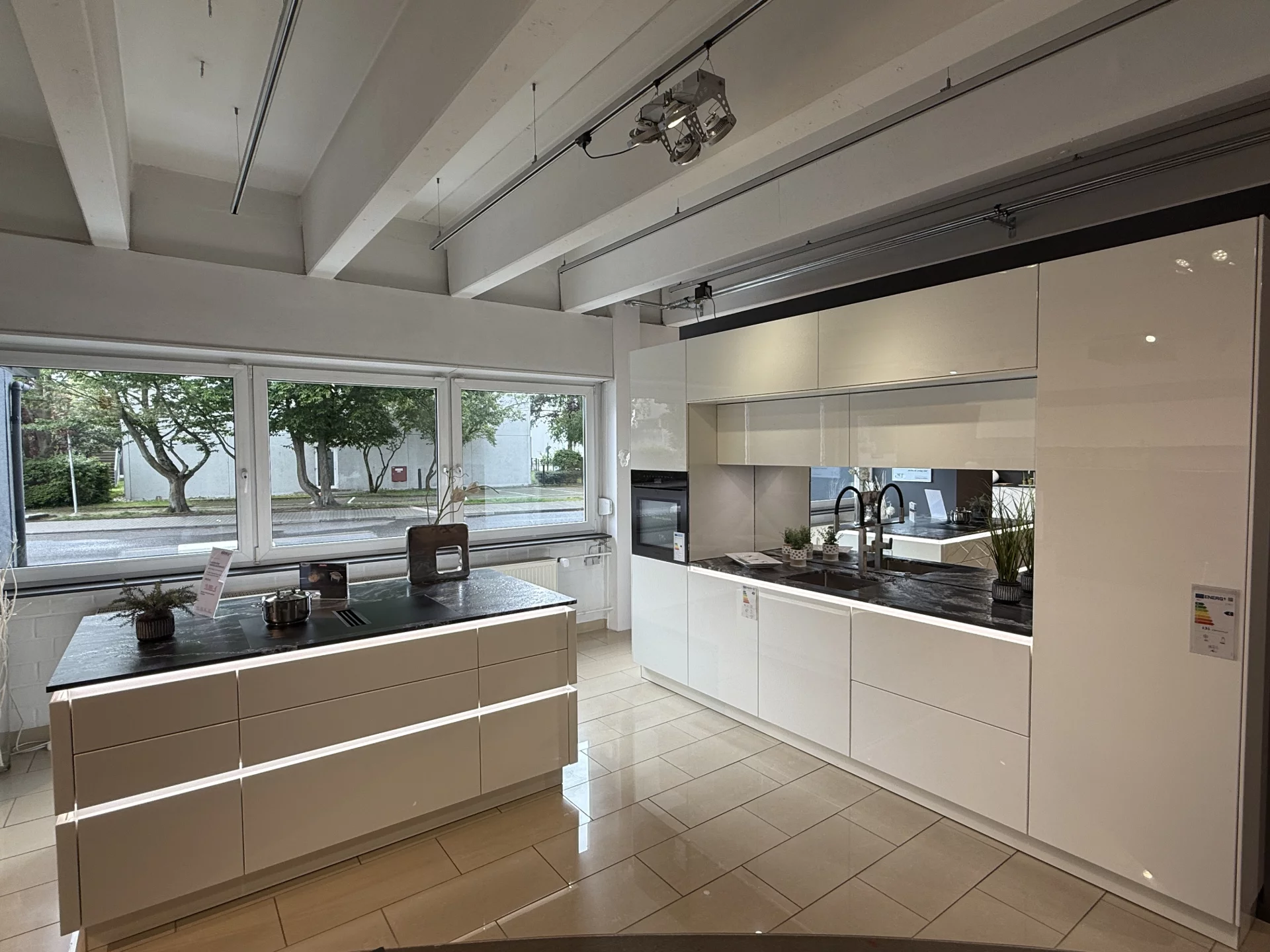 Moderne Häcker Musterküche im Abverkauf – Design trifft Funktion Diese hochwertige Musterküche von Häcker in elegantem Weiß Hochglanz verbindet modernes Design mit durchdachter Technik. Die grifflose Gestaltung sorgt für klare Linien und eine zeitlose Optik. Zentrales Element ist das Miele Induktionskochfeld mit integriertem Muldenlüfter in edlem Schwarzmatt – stilvoll und funktional zugleich. Eine steuerbare Ambientebeleuchtung umrahmt sowohl die Kochinsel als auch die Küchenzeile und setzt stimmungsvolle Akzente im Raum. Ergänzt wird die Küche durch hochwertige Miele Einbaugeräte: Backofen, Kühlschrank und Geschirrspüler bieten zuverlässige Leistung und modernen Bedienkomfort. Die edle Naturstein Arbeitsplatte in „Black Forest caress“-Optik sowie Spüle und Armatur von Franke vervollständigen die gehobene Ausstattung. Als Musterküche ist sie frei umplanbar und flexibel anpassbar – ideal für Ihr individuelles Zuhause.