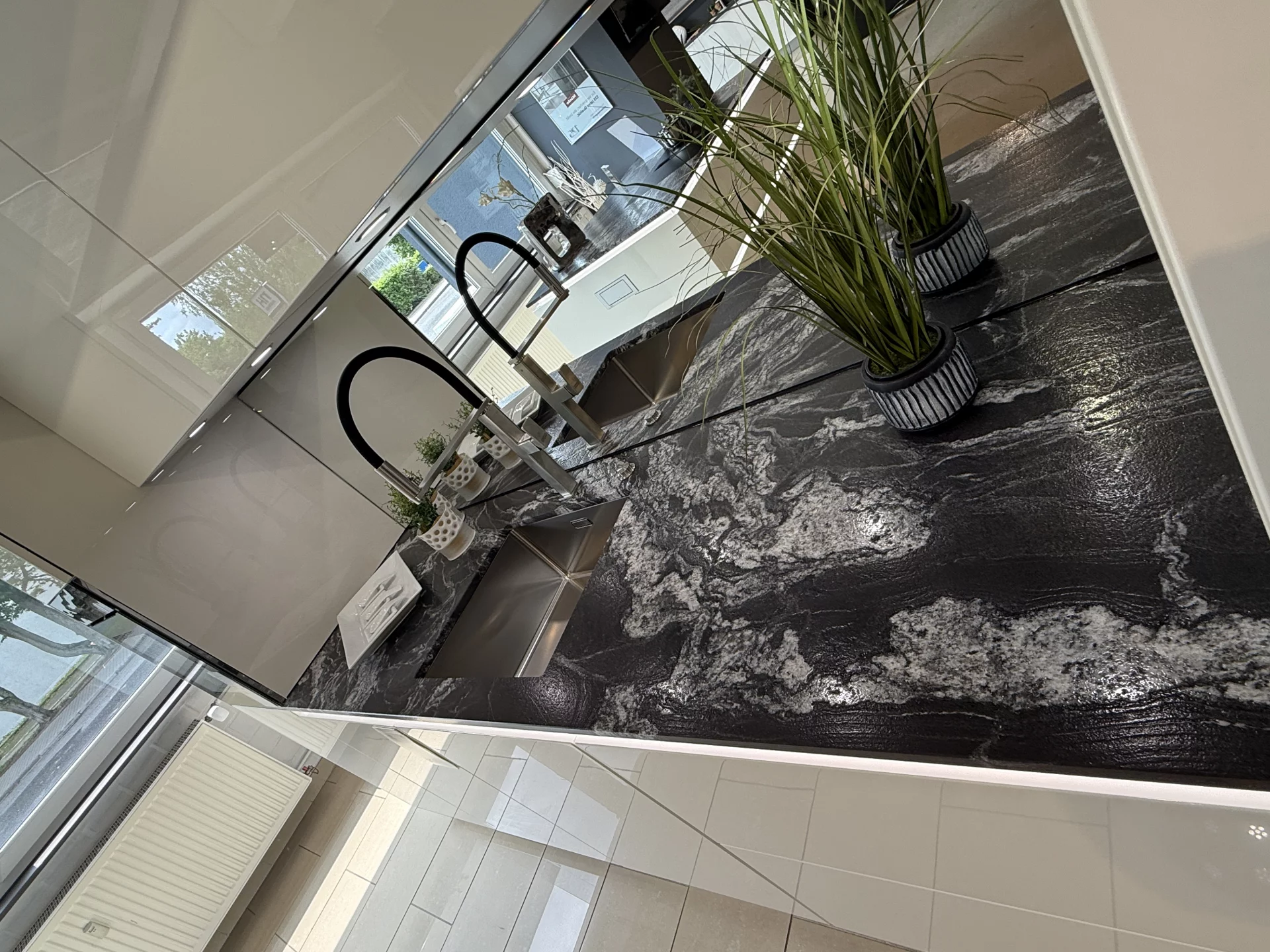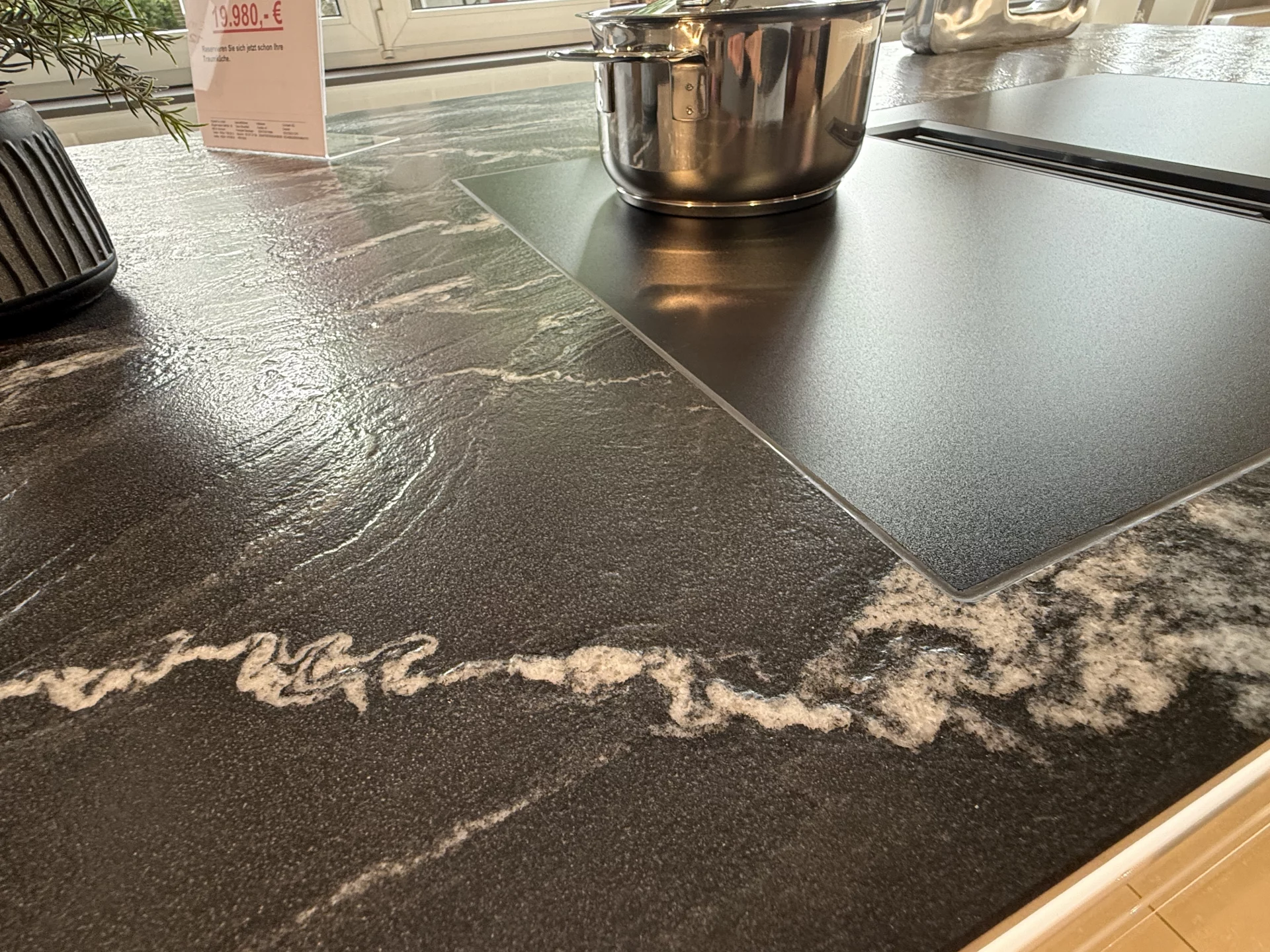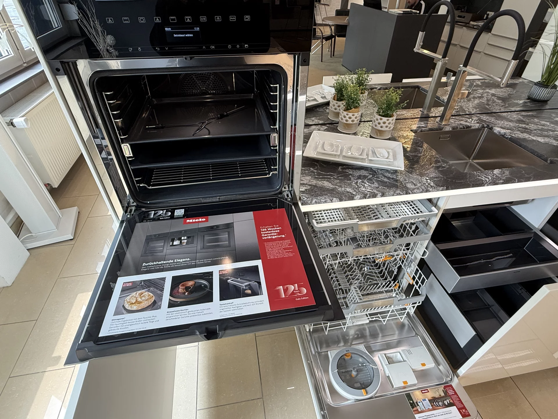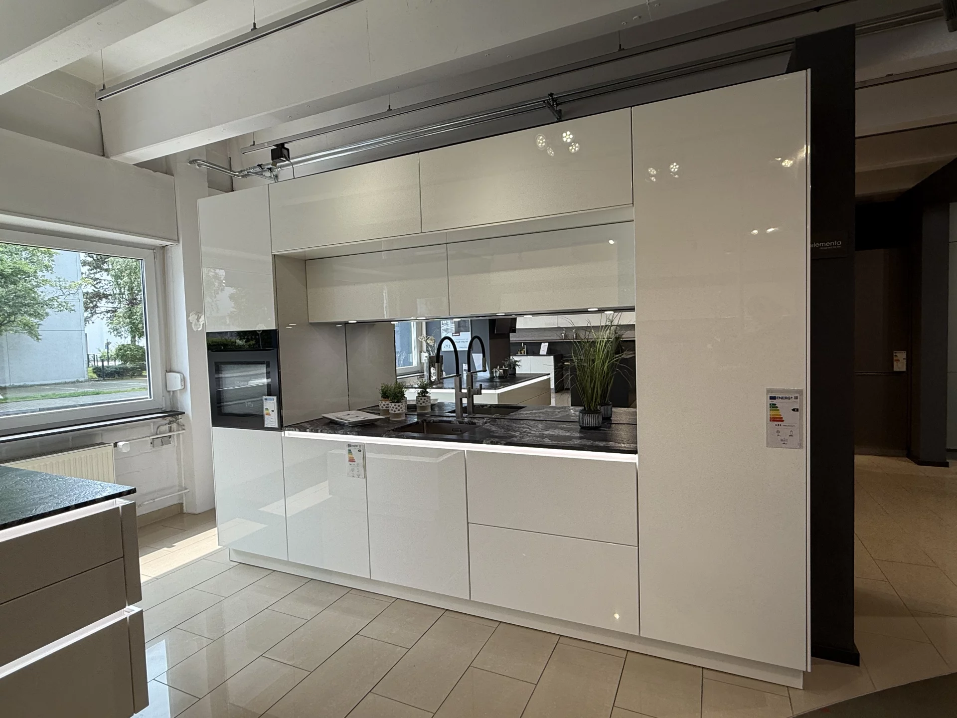 Moderne Häcker Musterküche im Abverkauf – Design trifft Funktion Diese hochwertige Musterküche von Häcker in elegantem Weiß Hochglanz verbindet modernes Design mit durchdachter Technik. Die grifflose Gestaltung sorgt für klare Linien und eine zeitlose Optik. Zentrales Element ist das Miele Induktionskochfeld mit integriertem Muldenlüfter in edlem Schwarzmatt – stilvoll und funktional zugleich. Eine steuerbare Ambientebeleuchtung umrahmt sowohl die Kochinsel als auch die Küchenzeile und setzt stimmungsvolle Akzente im Raum. Ergänzt wird die Küche durch hochwertige Miele Einbaugeräte: Backofen, Kühlschrank und Geschirrspüler bieten zuverlässige Leistung und modernen Bedienkomfort. Die edle Naturstein Arbeitsplatte in „Black Forest caress“-Optik sowie Spüle und Armatur von Franke vervollständigen die gehobene Ausstattung. Als Musterküche ist sie frei umplanbar und flexibel anpassbar – ideal für Ihr individuelles Zuhause.