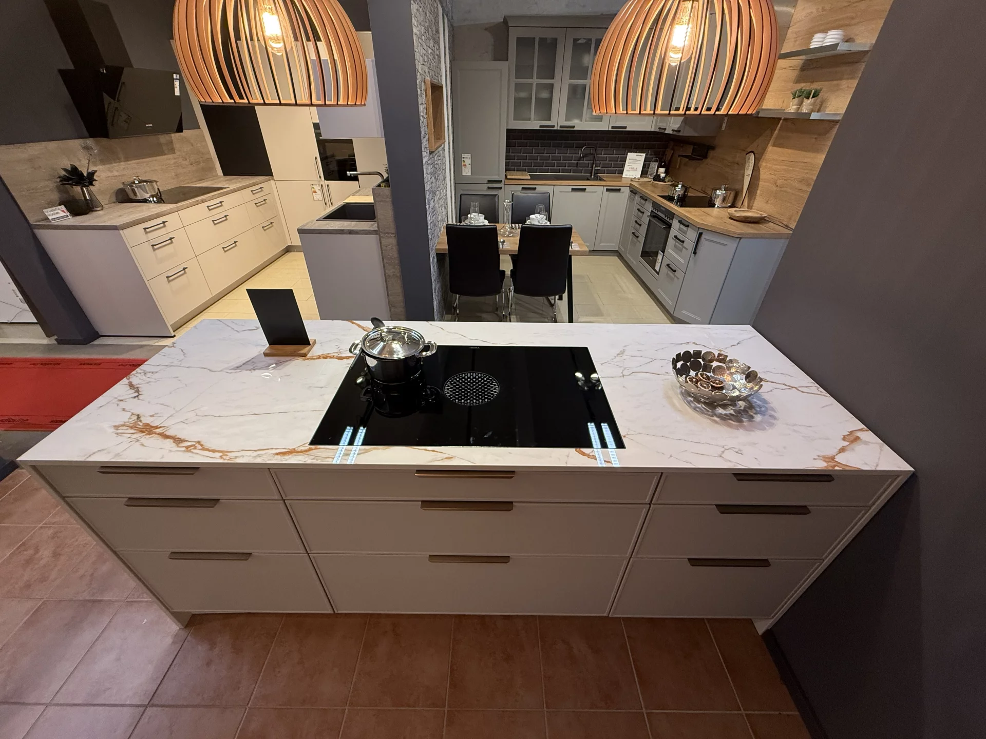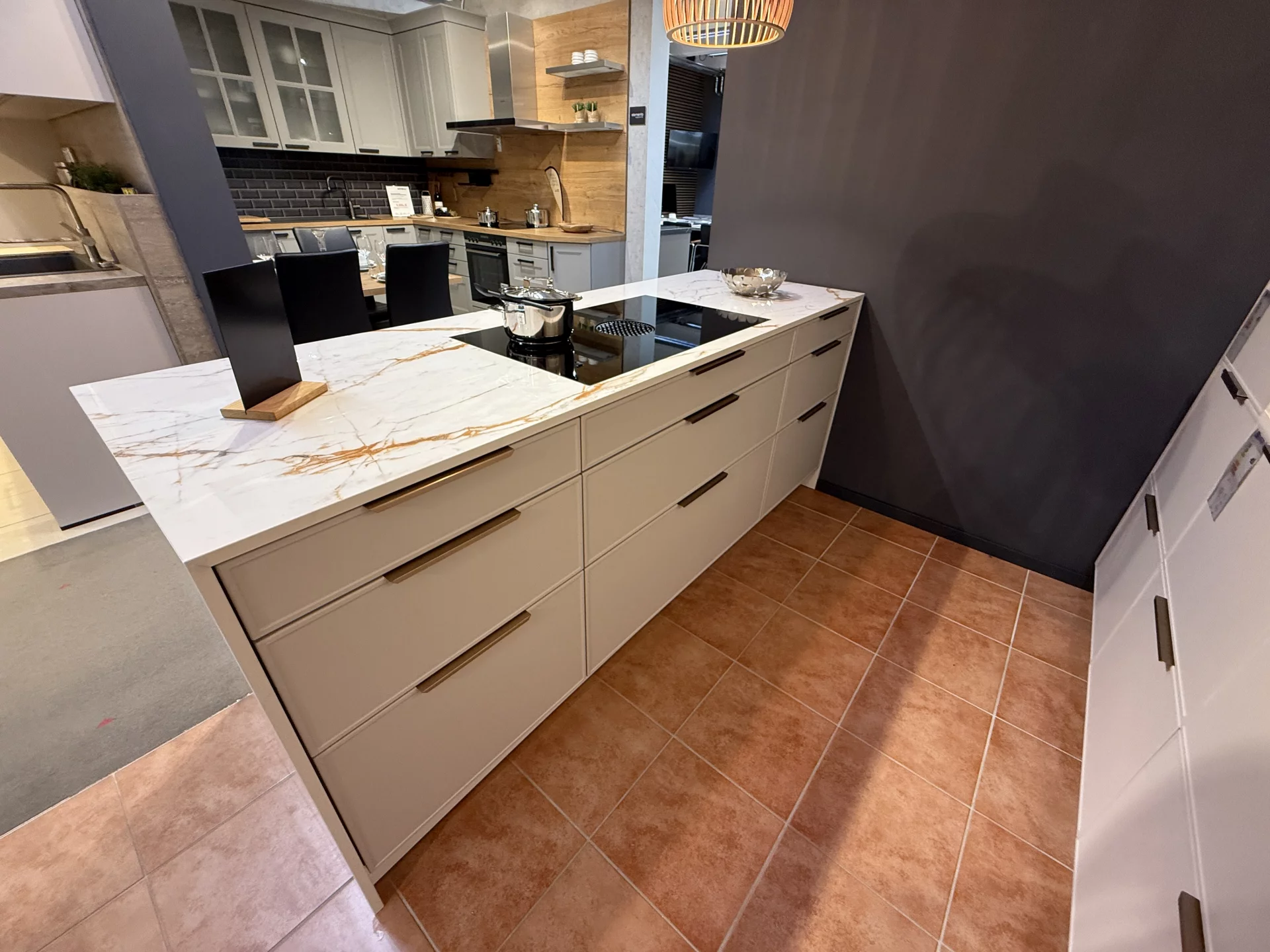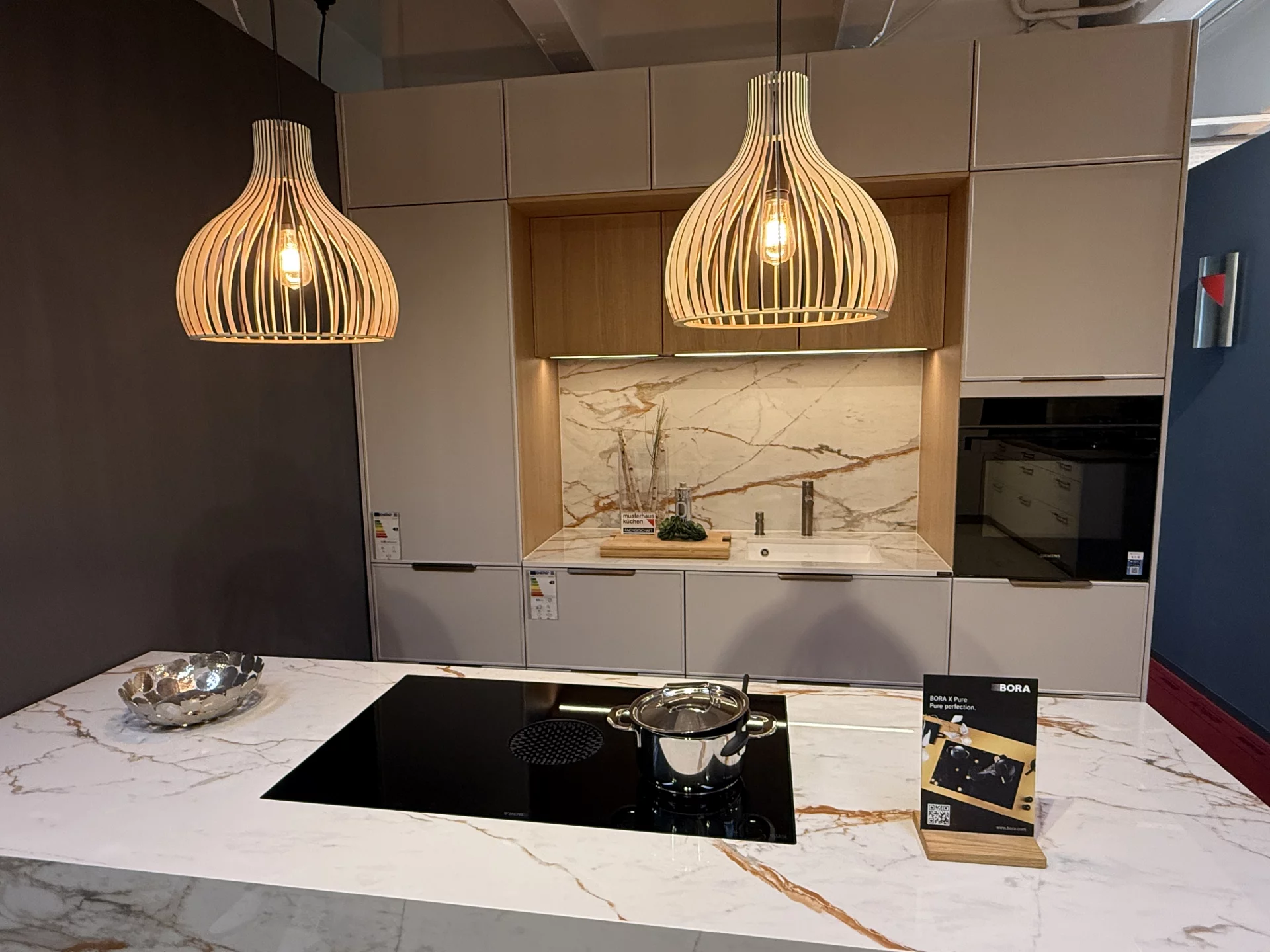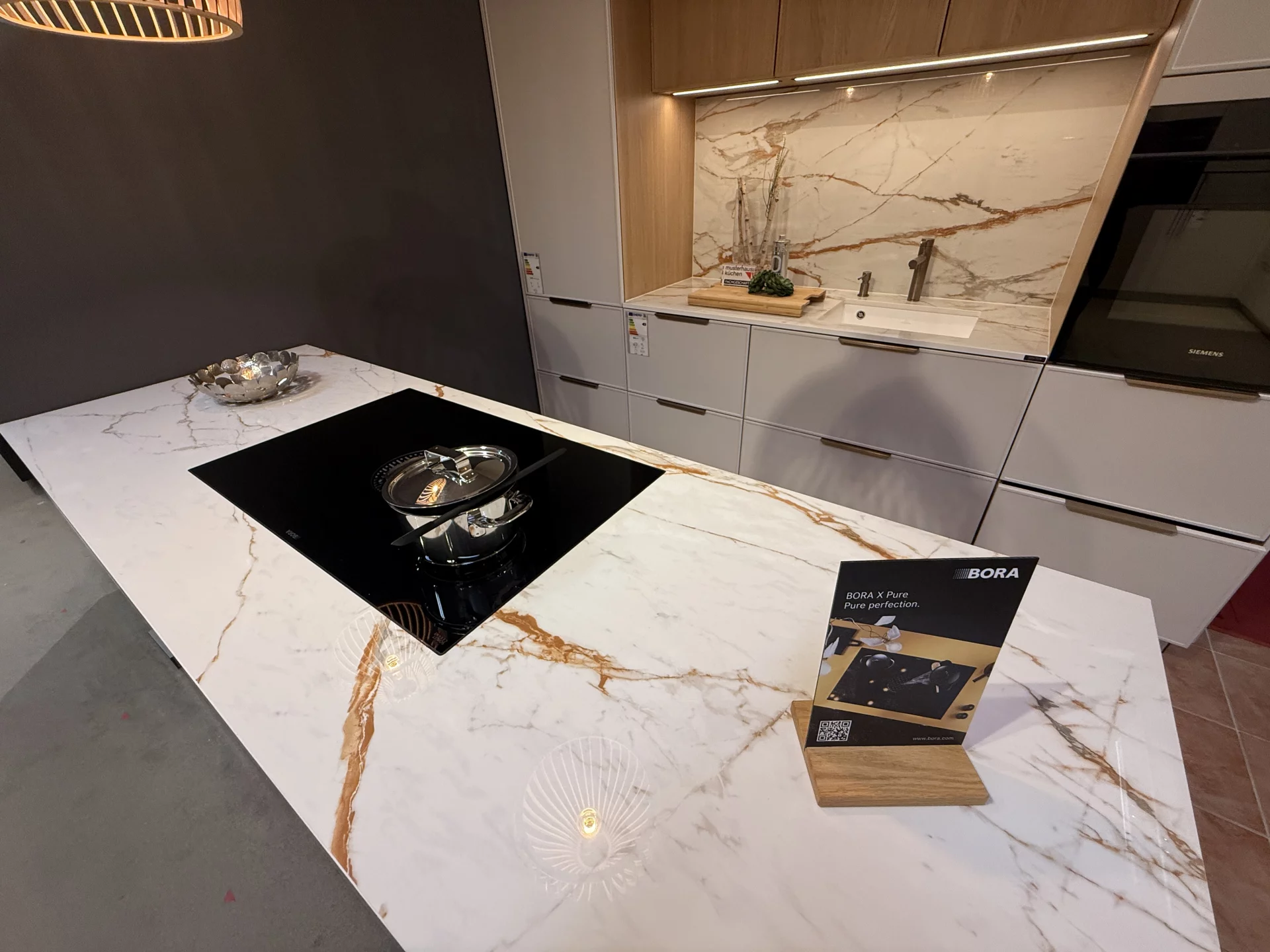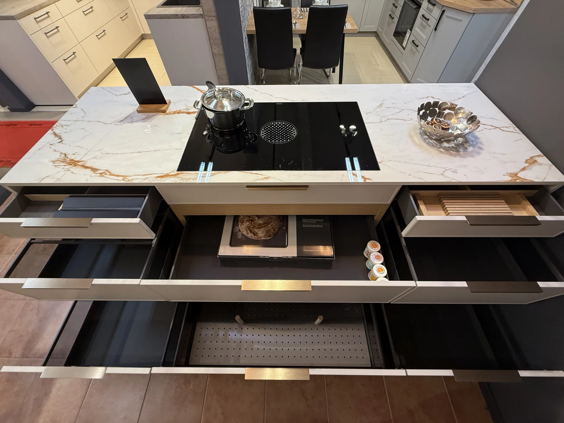 Diese Häcker Küche besticht durch klare Linien, hochwertige Materialien und moderne Ausstattung. Die Fronten in Sandgrau Mattlack verleihen ihr eine elegante, zeitlose Ausstrahlung. Im Mittelpunkt steht die großzügige Kochinsel, die mit Dekton umhüllt ist und so zum repräsentativen Blickfang wird. Für höchste Kochkultur ist die Küche mit einem Bora Flächeninduktionskochfeld mit integriertem Abzug sowie modernen Siemens-Einbaugeräten ausgestattet – darunter ein Backofen mit Mikrowellenfunktion, ein vollintegrierter Geschirrspüler und ein Einbau-Kühlschrank. Ergänzt wird dies durch eine stilvolle Blanco-Armatur, Spülmittelspender und Abfallsystem. Als Häcker Küche steht sie für Qualität, Langlebigkeit und Flexibilität. Sie ist erweiterbar und individuell umplanbar und passt sich so perfekt an verschiedene Raumkonzepte und persönliche Wünsche an.