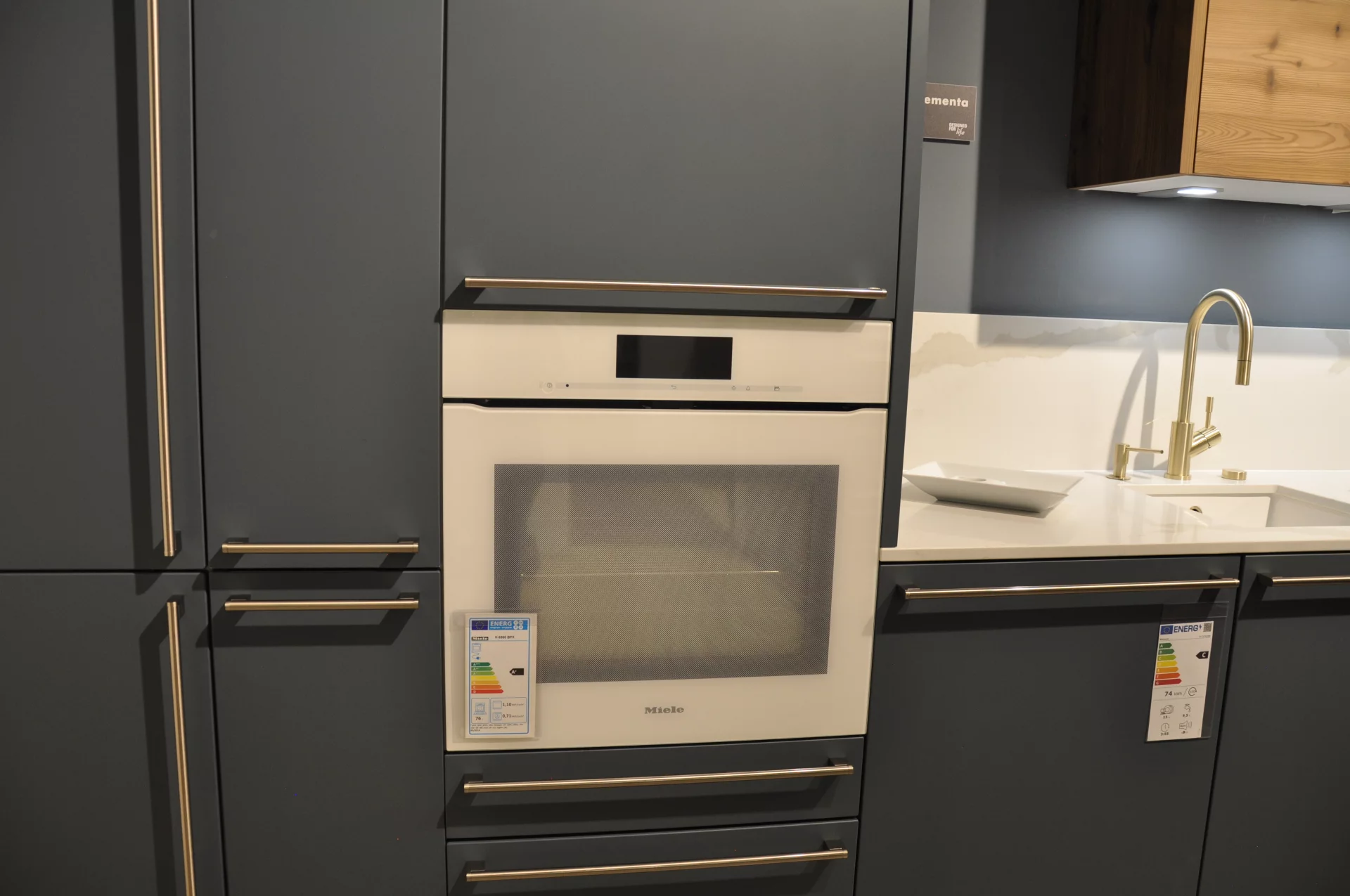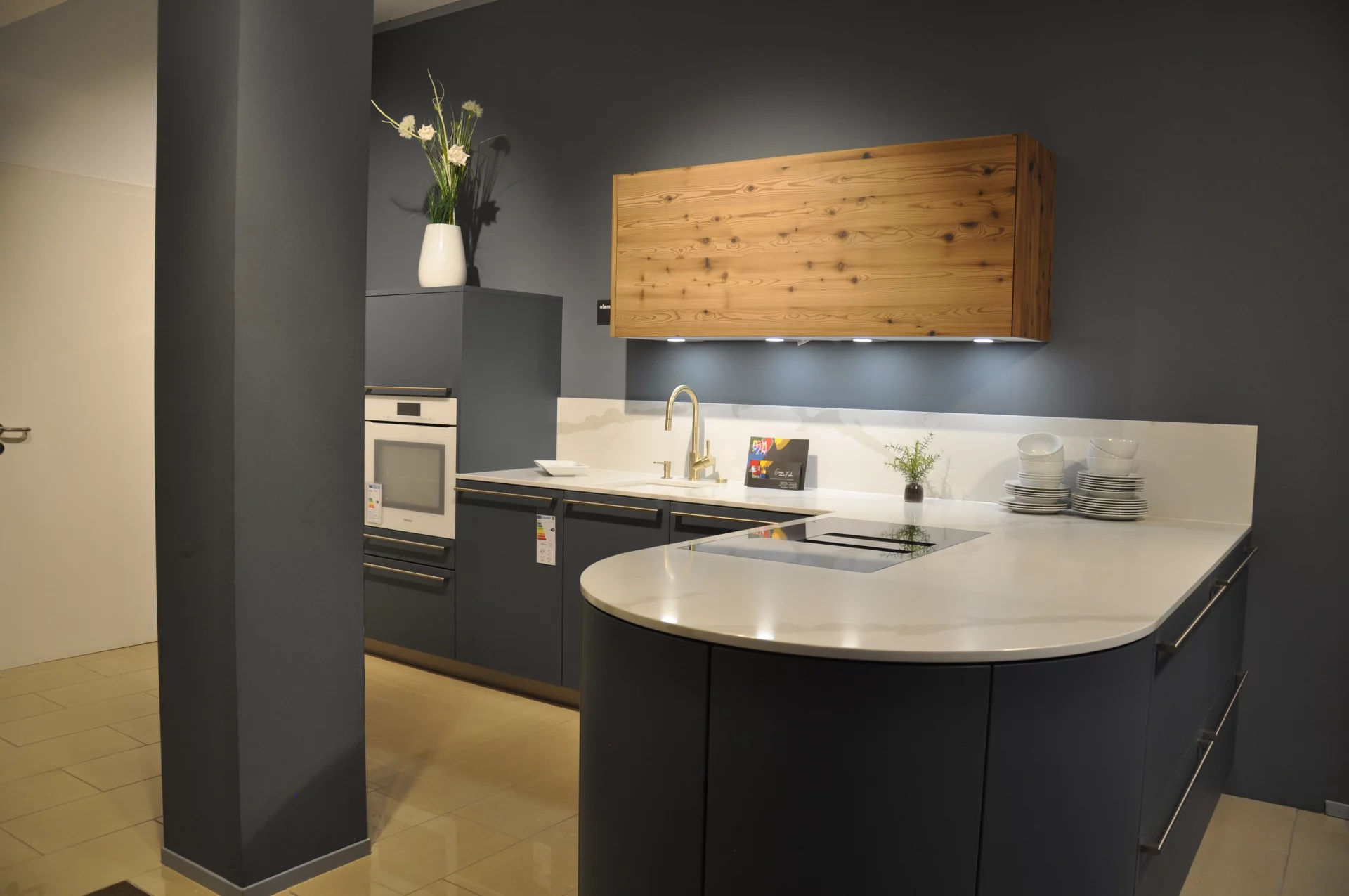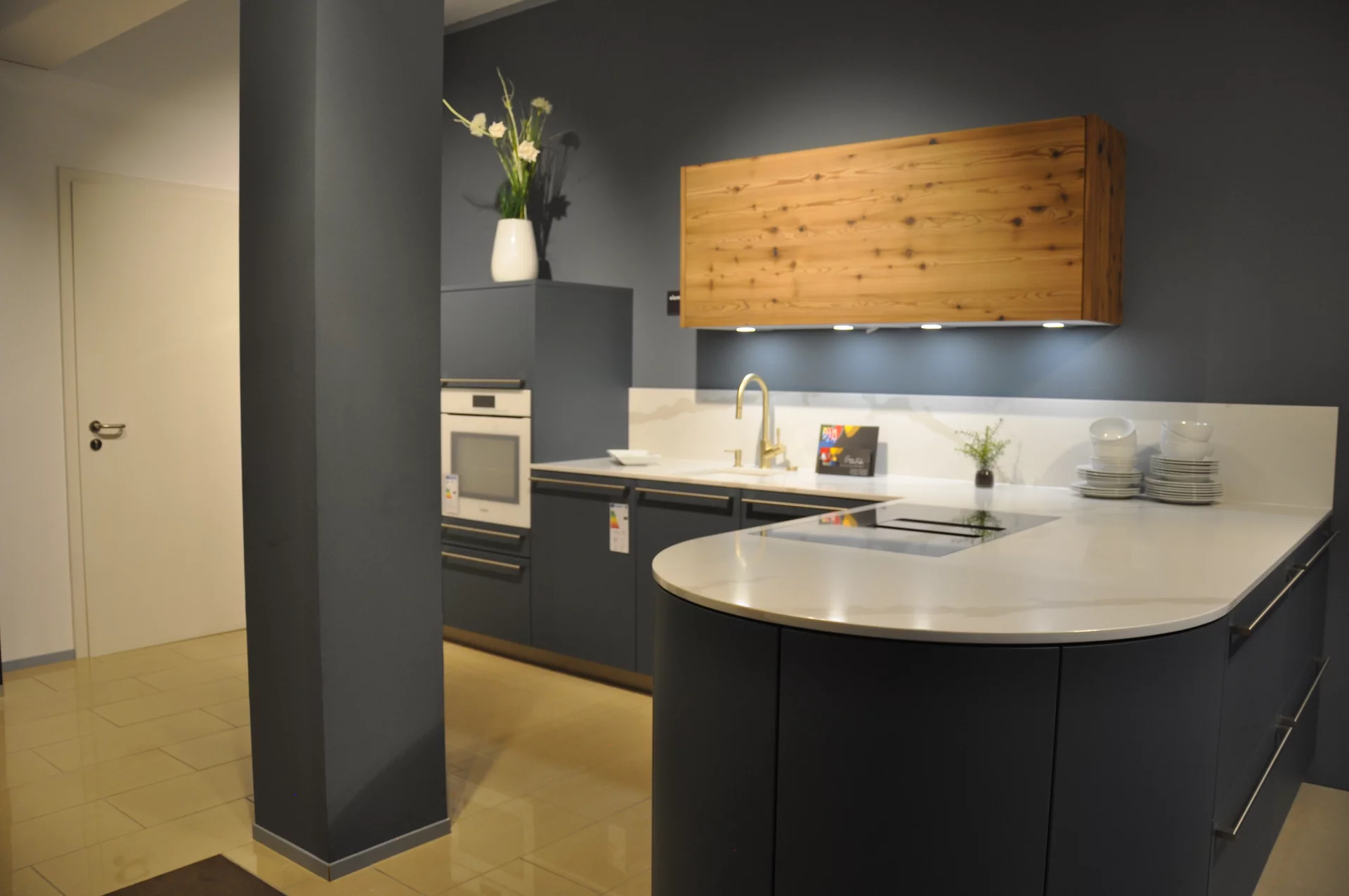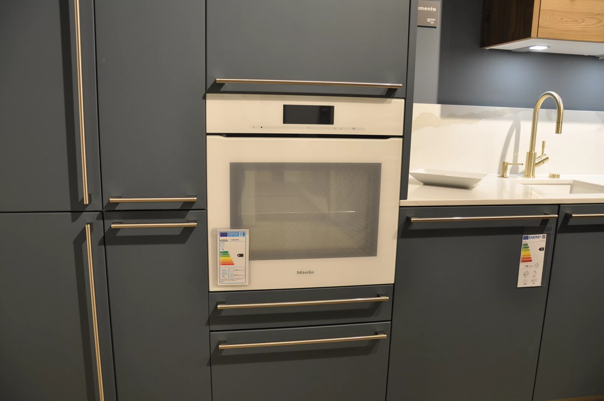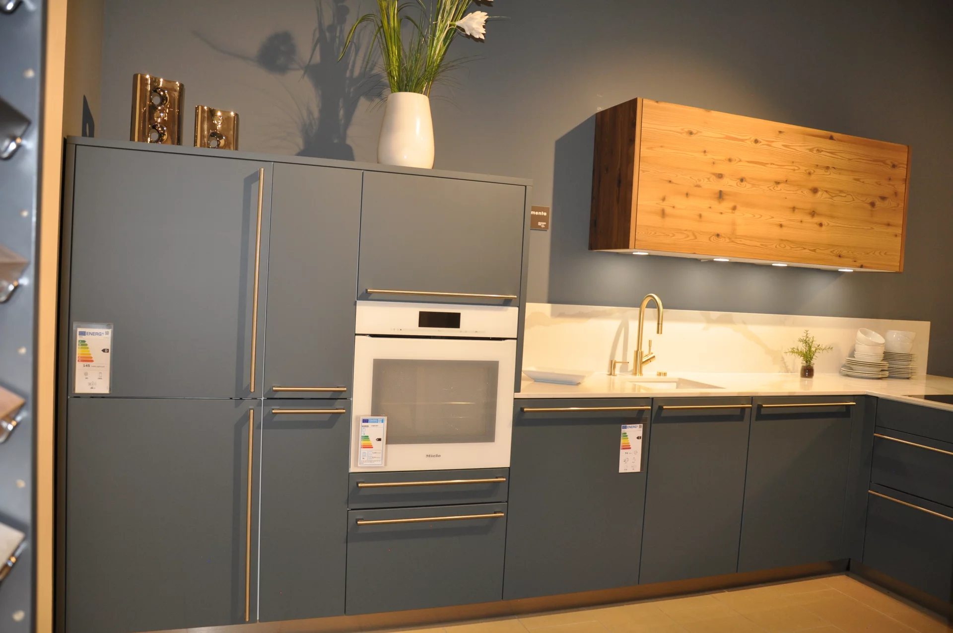 Moderne Häcker Systemat Einbauküche. Ein Unikat sind die Fronten in eine Sonderlackierung nach RAL-Farbsystem Blaugrau. Die Arbeitsflächen sowie die Wandverkleidungen aus Quarzkomposit Fasa Stone, Calacatta Golden poliert, verleihen diese Küche das einmalige Design. Ausgestattet mit Marken Geräten der Firma Siemens, Miele und Berbel der neuesten Generation sowie Highlights wie LED-Beleuchtung, Villeroy & Boch Armatur und Seifenspender goldfarben abgesetzt. Die Küche lässt sich frei umplanen und beliebig erweitern.