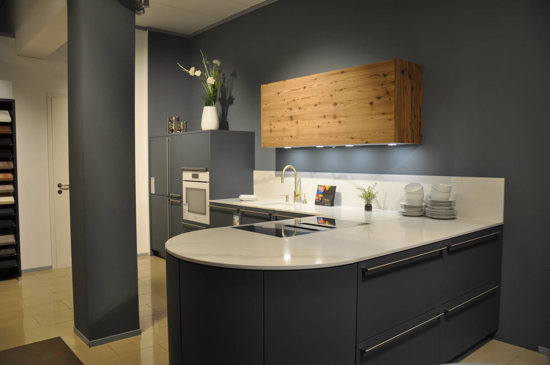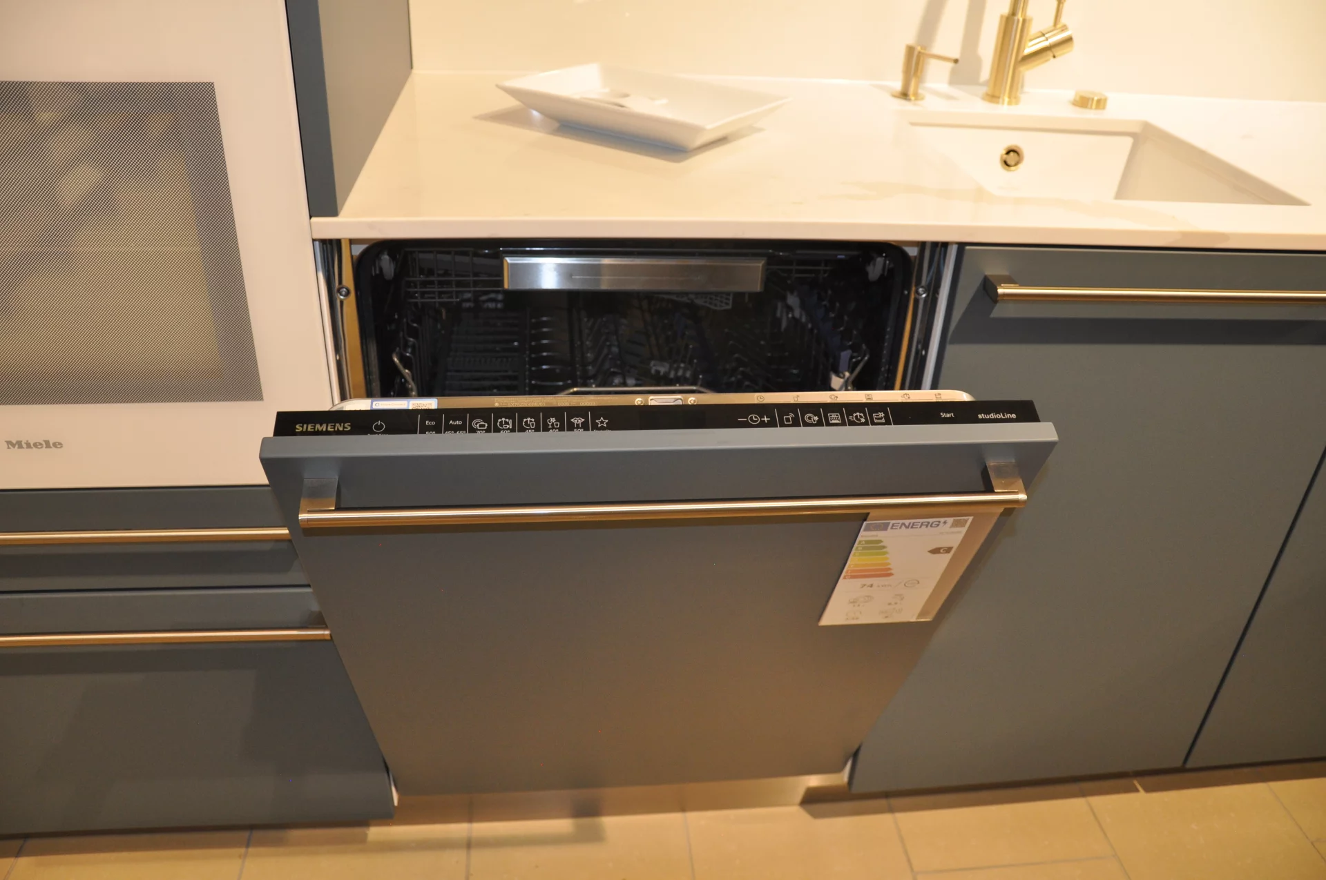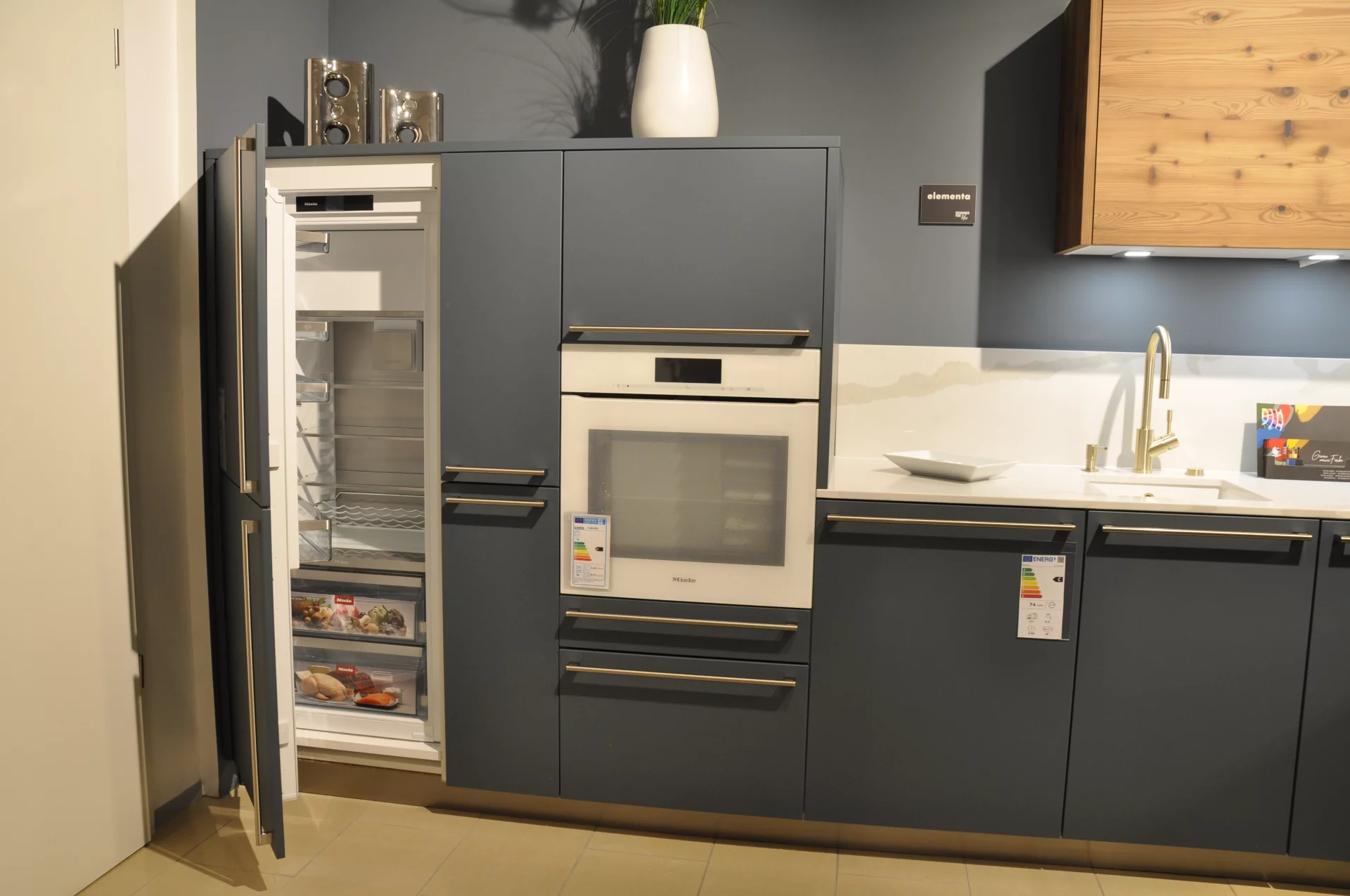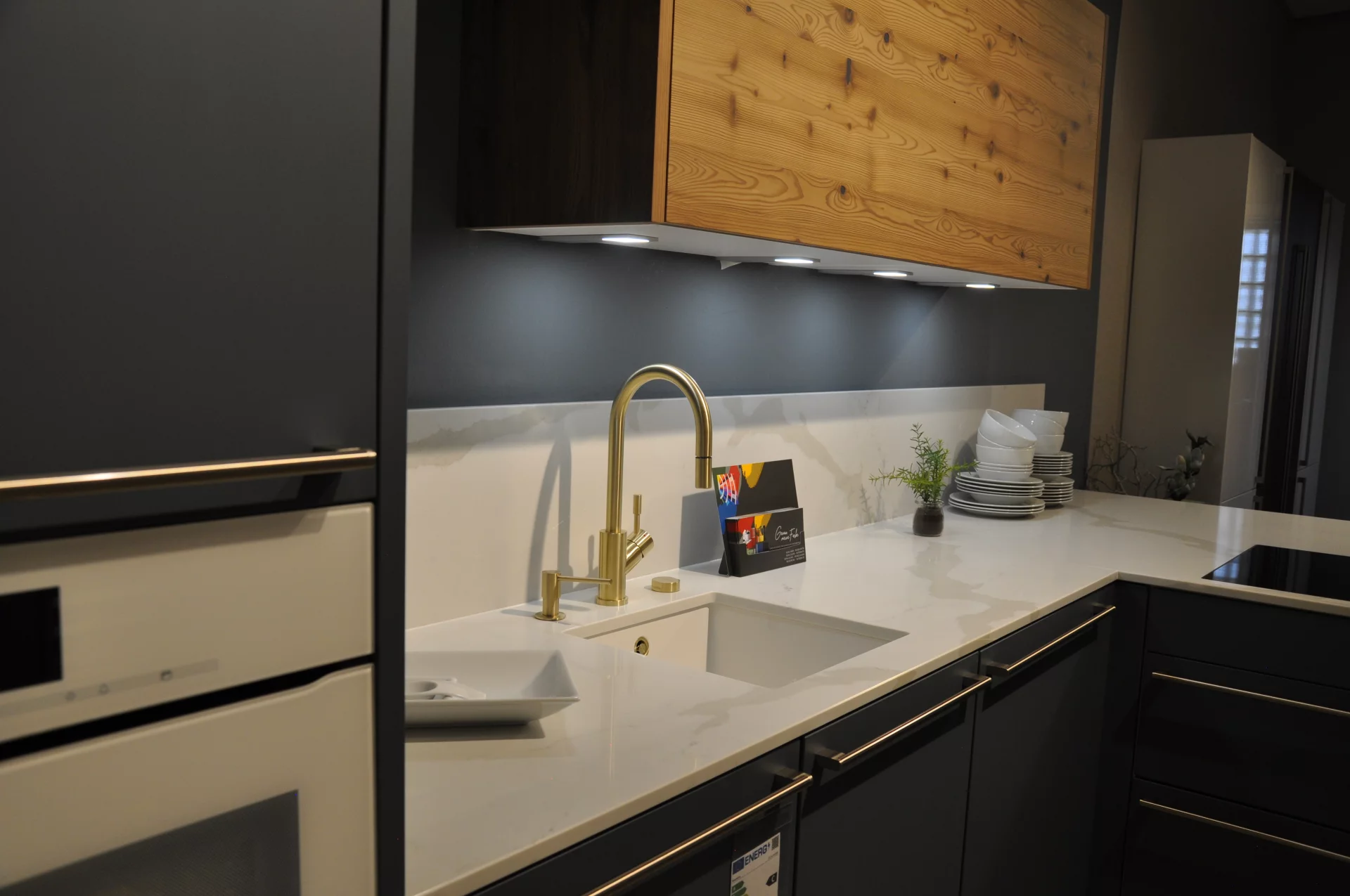 Moderne Häcker Systemat Einbauküche. Ein Unikat sind die Fronten in eine Sonderlackierung nach RAL-Farbsystem Blaugrau. Die Arbeitsflächen sowie die Wandverkleidungen aus Quarzkomposit Fasa Stone, Calacatta Golden poliert, verleihen diese Küche das einmalige Design. Ausgestattet mit Marken Geräten der Firma Siemens, Miele und Berbel der neuesten Generation sowie Highlights wie LED-Beleuchtung, Villeroy & Boch Armatur und Seifenspender goldfarben abgesetzt. Die Küche lässt sich frei umplanen und beliebig erweitern.