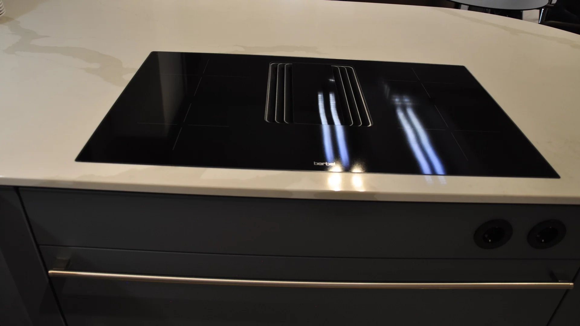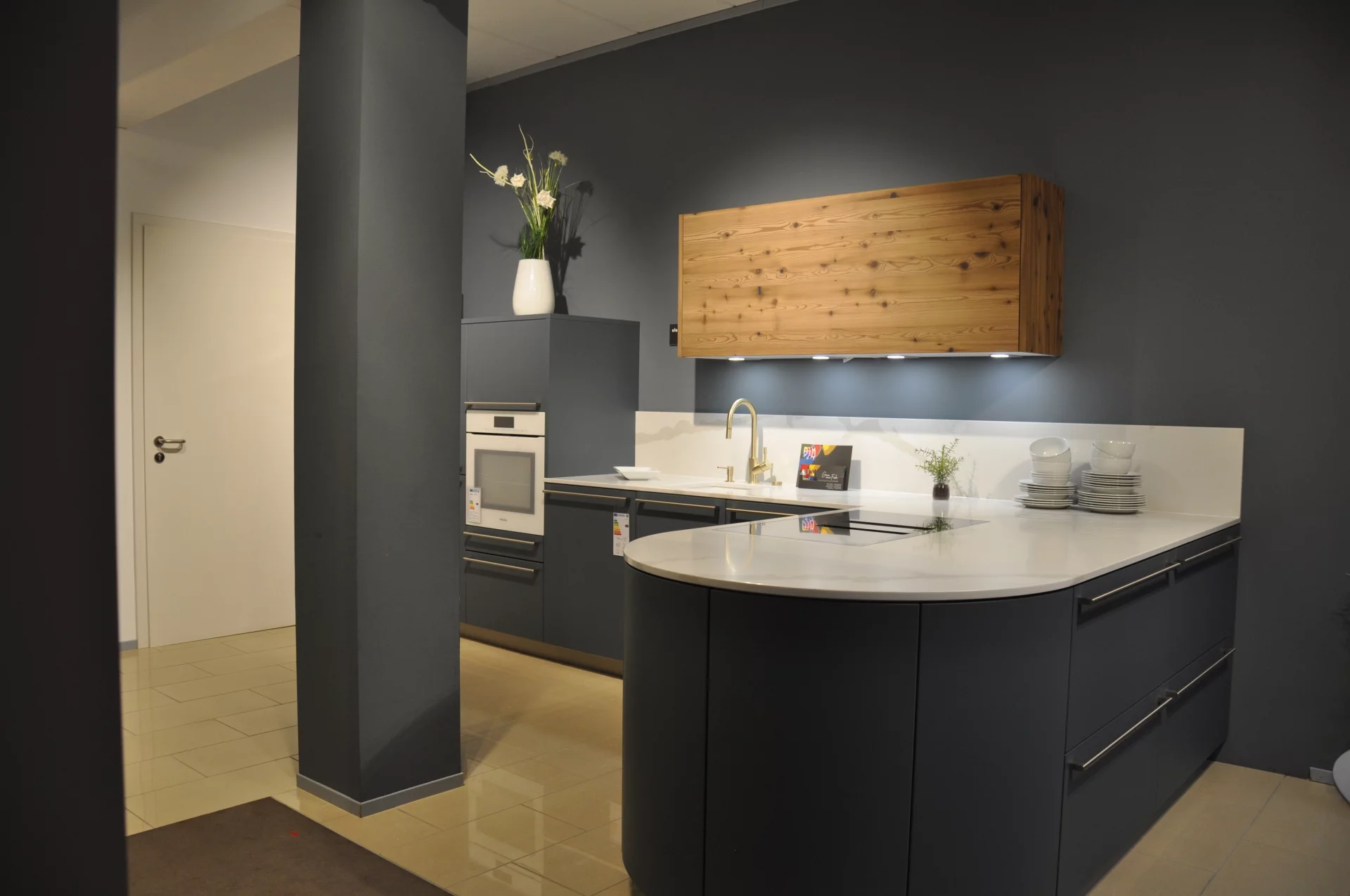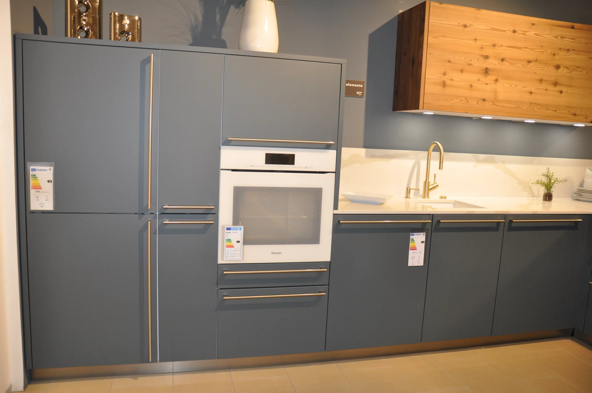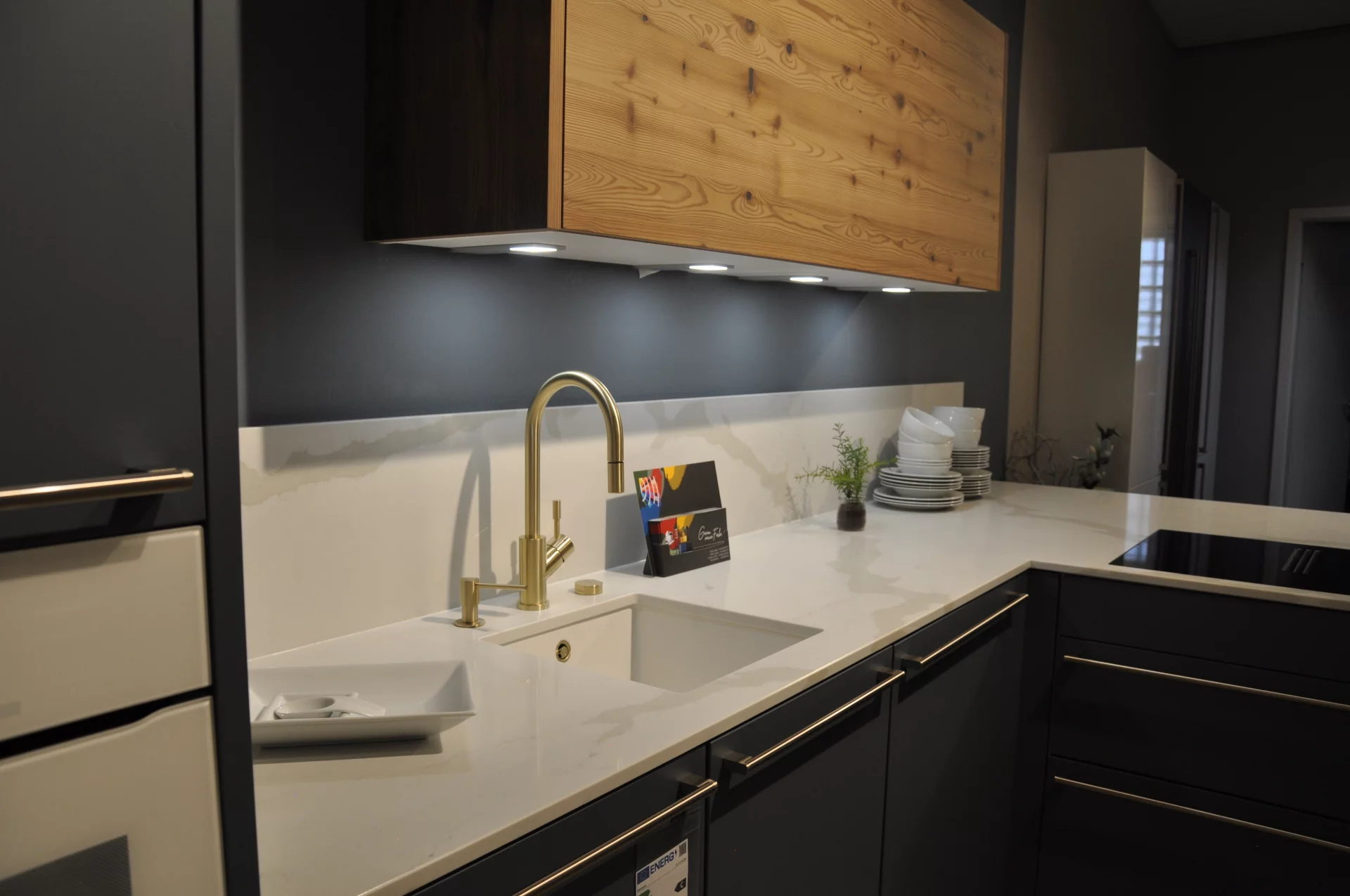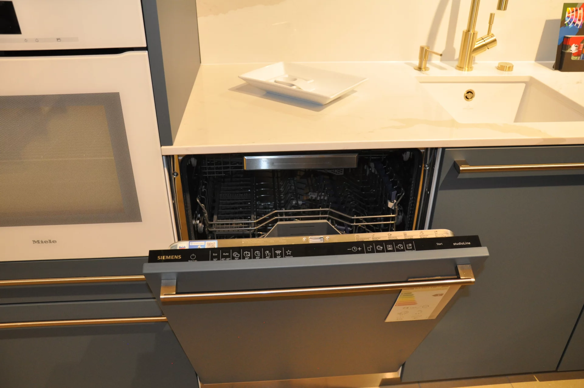 Moderne Häcker Systemat Einbauküche. Ein Unikat sind die Fronten in eine Sonderlackierung nach RAL-Farbsystem Blaugrau. Die Arbeitsflächen sowie die Wandverkleidungen aus Quarzkomposit Fasa Stone, Calacatta Golden poliert, verleihen diese Küche das einmalige Design. Ausgestattet mit Marken Geräten der Firma Siemens, Miele und Berbel der neuesten Generation sowie Highlights wie LED-Beleuchtung, Villeroy & Boch Armatur und Seifenspender goldfarben abgesetzt. Die Küche lässt sich frei umplanen und beliebig erweitern.