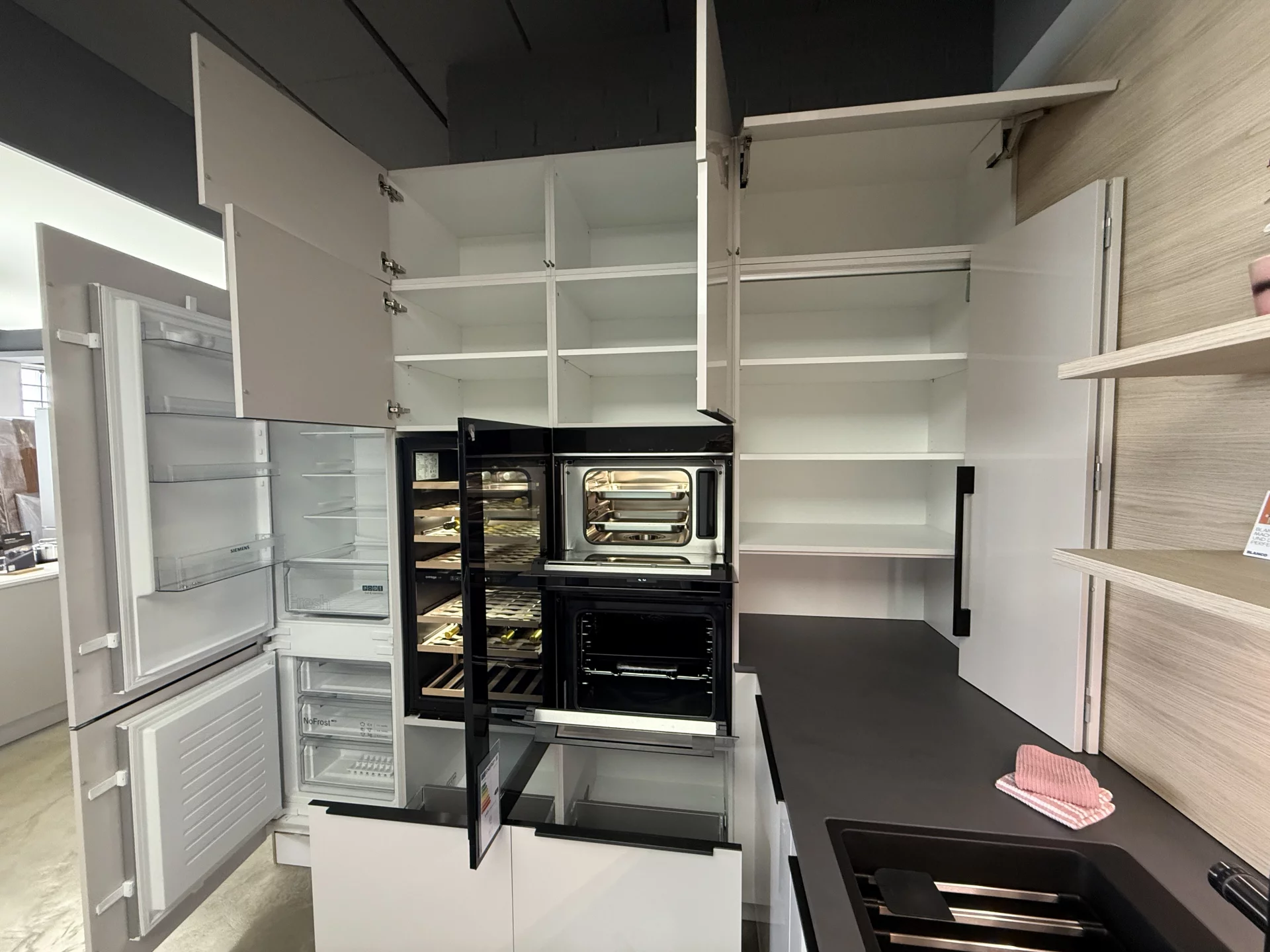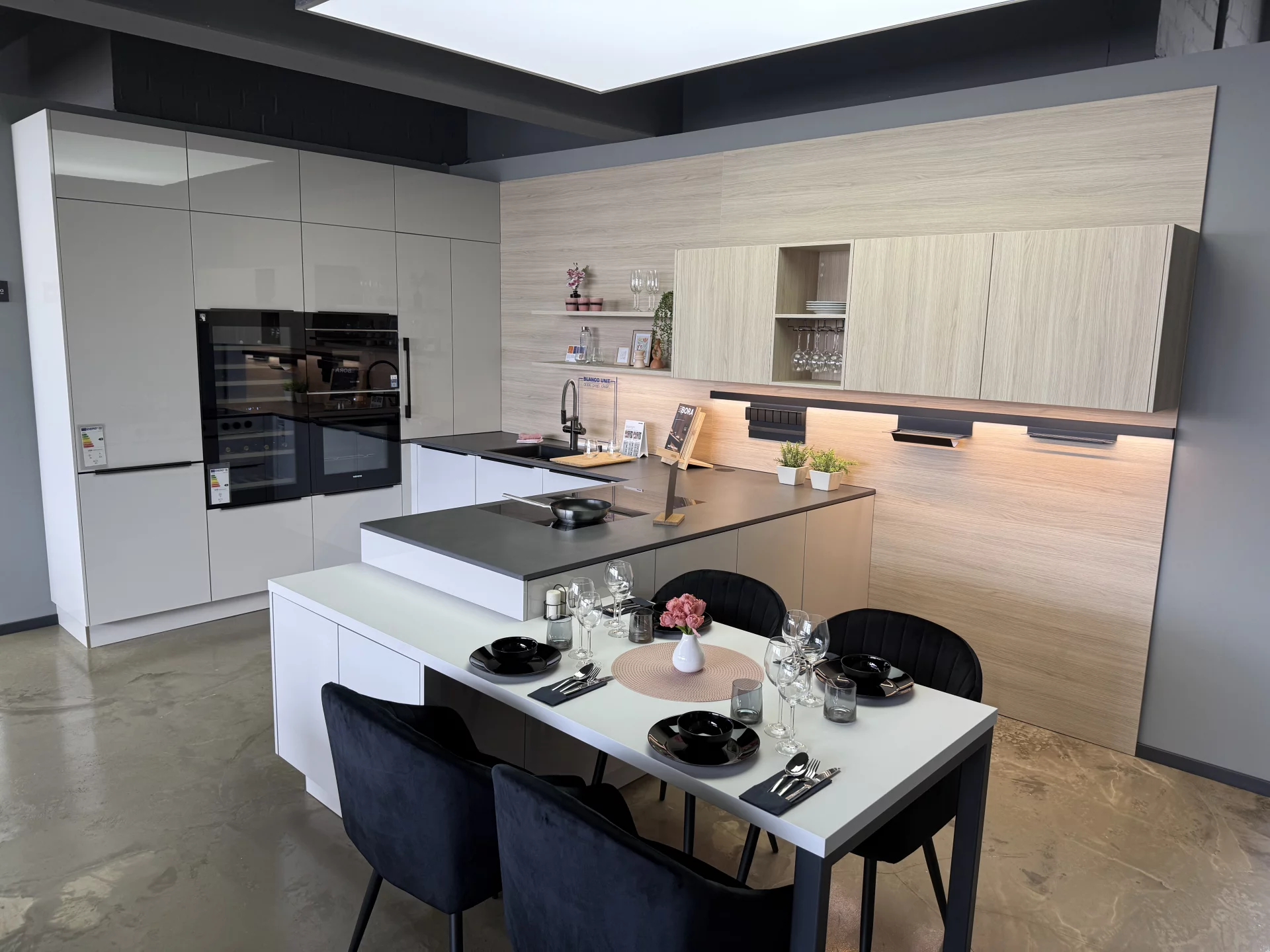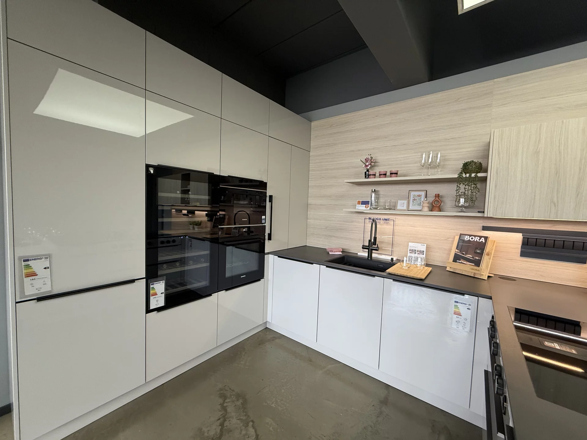 Exklusive Musterküche im Abverkauf – Modernes Design trifft Premium-Ausstattung. Diese Häcker Musterküche vereint hochwertiges Design und erstklassige Markenprodukte. Die eleganten "Perfect Brilliant Satin" Oberflächen sorgen für eine moderne Atmosphäre, während die Küche gleichzeitig durchdachte Funktionalität bietet. Das BORA Professional Kochfeld mit integriertem Dunstabzug und das Vakuumierset ergänzen die Ausstattung perfekt. Die Siemens Einbaugeräte wie der Backofen, Dampfgarer, Geschirrspüler und die Kühl-Gefrier-Kombination bieten Ihnen alles, was Sie für eine leistungsstarke Küche benötigen. Die Dekton Arbeitsplatte in Micron ultra-matt ist pflegeleicht und widerstandsfähig. Die Blanco Spüle und die Choice Icona Armatur sind wahre Highlights und liefern auf Knopfdruck heißes Wasser sowie Sprudelwasser. Der integrierte Essplatz bietet einen geselligen Mittelpunkt für Ihre Familie und Gäste. Zudem sorgt der AVI Weinklimaschrank dafür, dass Ihre edlen Tropfen immer perfekt temperiert sind. Obwohl es sich um eine Musterküche handelt, ist sie frei umplanbar und lässt sich flexibel erweitern, sodass sie sich perfekt an den Grundriss Ihres Zuhauses anpassen lässt.