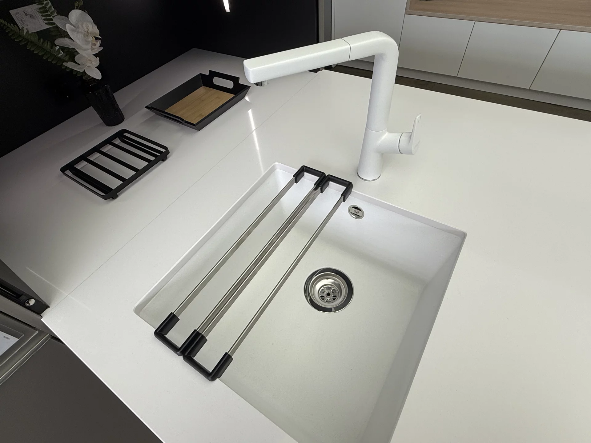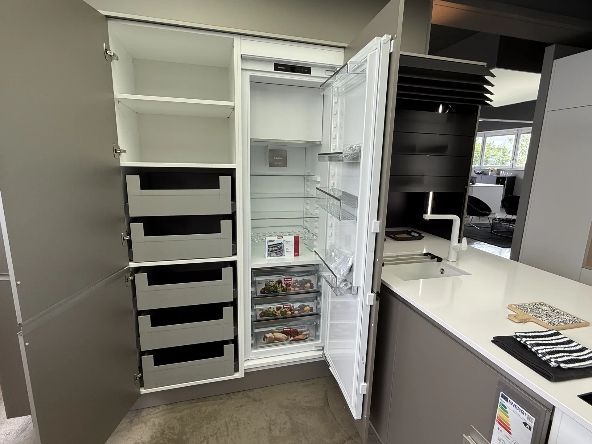 Die Häcker Küche - das ideale Zuhause für Ihre kulinarischen Abenteuer. Ein M Pure Induktionskochfeld von Bora bietet Ihnen die Möglichkeit, Ihre Lieblingsgerichte mit dem integrierten Kochfeldabzug zuzubereiten. Der High-end Geschirrspülautomat von Miele unterstützt Sie bei der Abwascharbeit, während der Dampfbackofen von Miele Ihnen die Möglichkeit gibt, Ihre Kreationen auf hohem Niveau auszubilden. Der Einbau-Kühlschrank von Miele bietet genug Platz für Ihre Lebensmittel und Getränke. Ein besonderes Highlight ist der Climber-Aufsatz mit Glaslamellen, der per Knopfdruck nach oben gefahren werden kann. Dieser Aufsatz bietet Ihnen während der Zubereitung mehr Freiraum und erleichtert das Arbeiten in der Küche. Er verbindet Design und Funktionalität in perfekter Weise und sieht dabei sehr ästhetisch aus. Ein zusätzliches Sideboard bietet genug Platz für Ihre täglichen Geschirr und andere Utensilien und sorgt somit für eine Ordnung und Sauberkeit in Ihrer Küche. Die Hacker Küche lässt sich frei umplanen und beliebig erweitern, um Ihre individuellen Bedürfnisse zu erfüllen.
