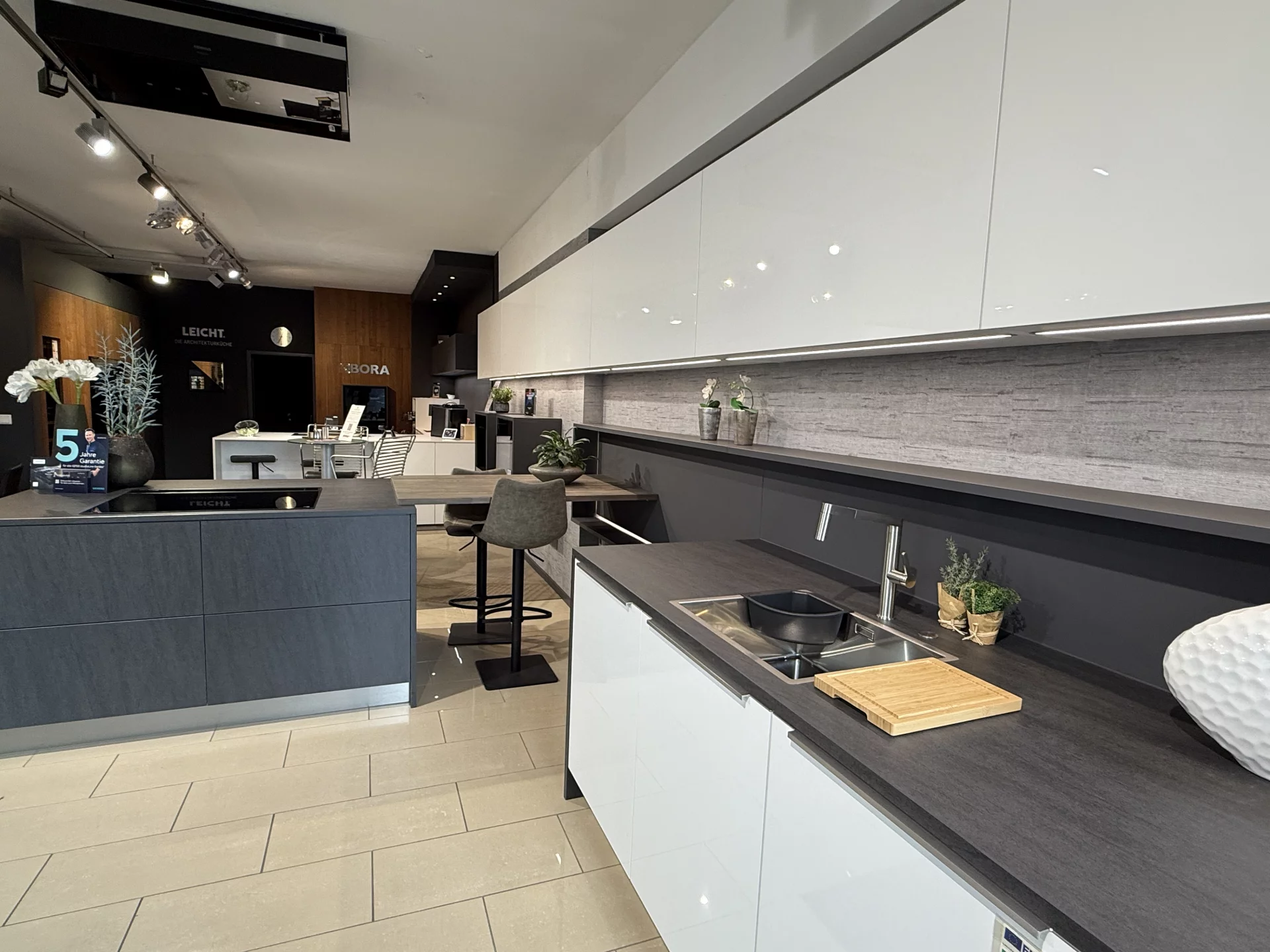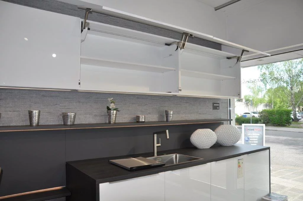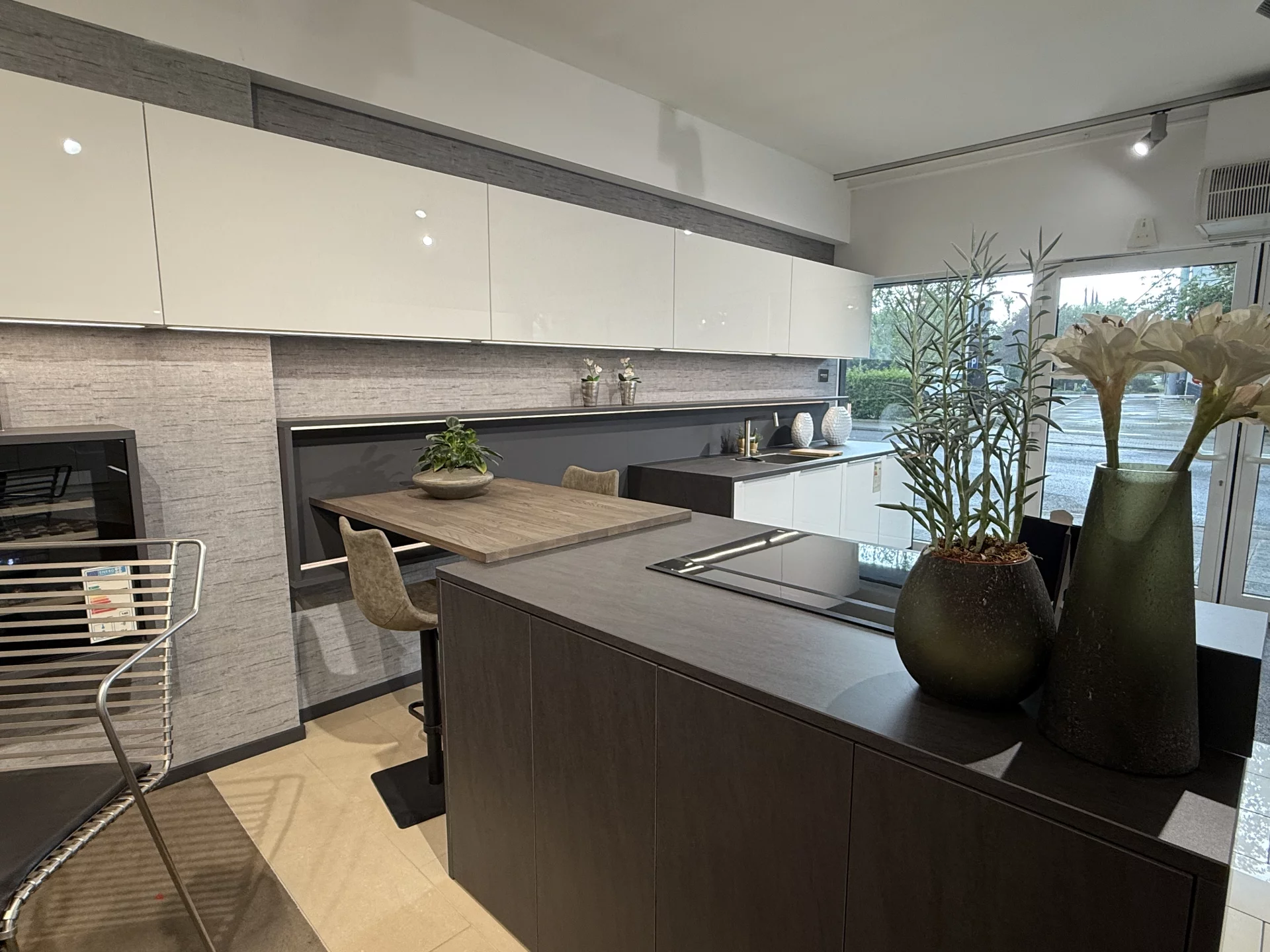 Attraktive Häcker Küche mit Hochglanz lackierten kristallweißen Fronten (PerfectSense®) und Arbeitsflächen aus Keramik, Neolith Basalt schwarz. Ausgestattet mit einem Siemens Backofen,Siemens Kompaktbackofen, Siemens Vakuumierschublade, Gaggenau Geschirrspüler, Siemens Kühl-Gefrierkombi mit 0C° Zone, Siemens glassdraftAir Tischlüfter Studioline und einem Siemens Induktionskochfeld strahlt diese Küche pure Exklusivität aus. Die Küche lässt sich frei umplanen und beliebig erweitern.